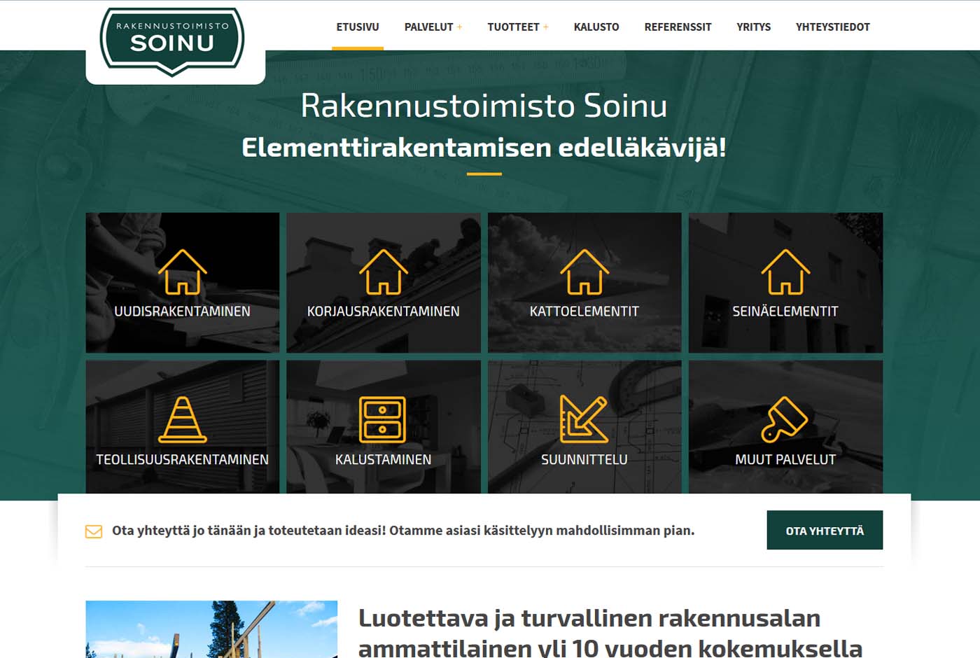 Yrityksen nettisivut sen sijaan eivät enää olleet edelläkävijöitä, sillä niillä alkoi olla ikää jo lähes 10 vuotta. Niinpä Mainostoimisto Ilmiö lähti nopeasti suunnittelemaan yritykselle sen ilmeen mukaista sivustoa, jossa tuotaisiin esille ennen kaikkea yrityksen vahvuutta eli elementtirakentamista.
