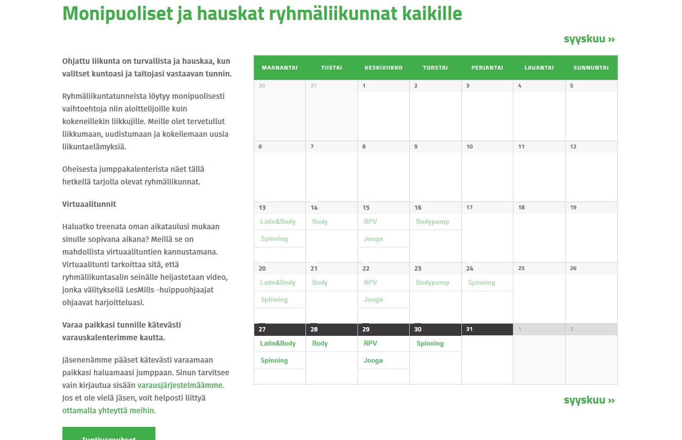 Liiketilassa suoritettiin kuvaukset, joilla saatiin hyvä pohja nettisivujen suunnitteluun. Sivuilla pyrittiin tuomaan monipuoliset palvelut mahdollisimman helposti käyttäjien nähtäville, tärkeimpänä elementtinä helposti päivitettävä ryhmäliikuntakalenteri.
